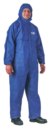 - kék, három rétegű, kapucnis SMS polipropilén overall, 65 g/m²